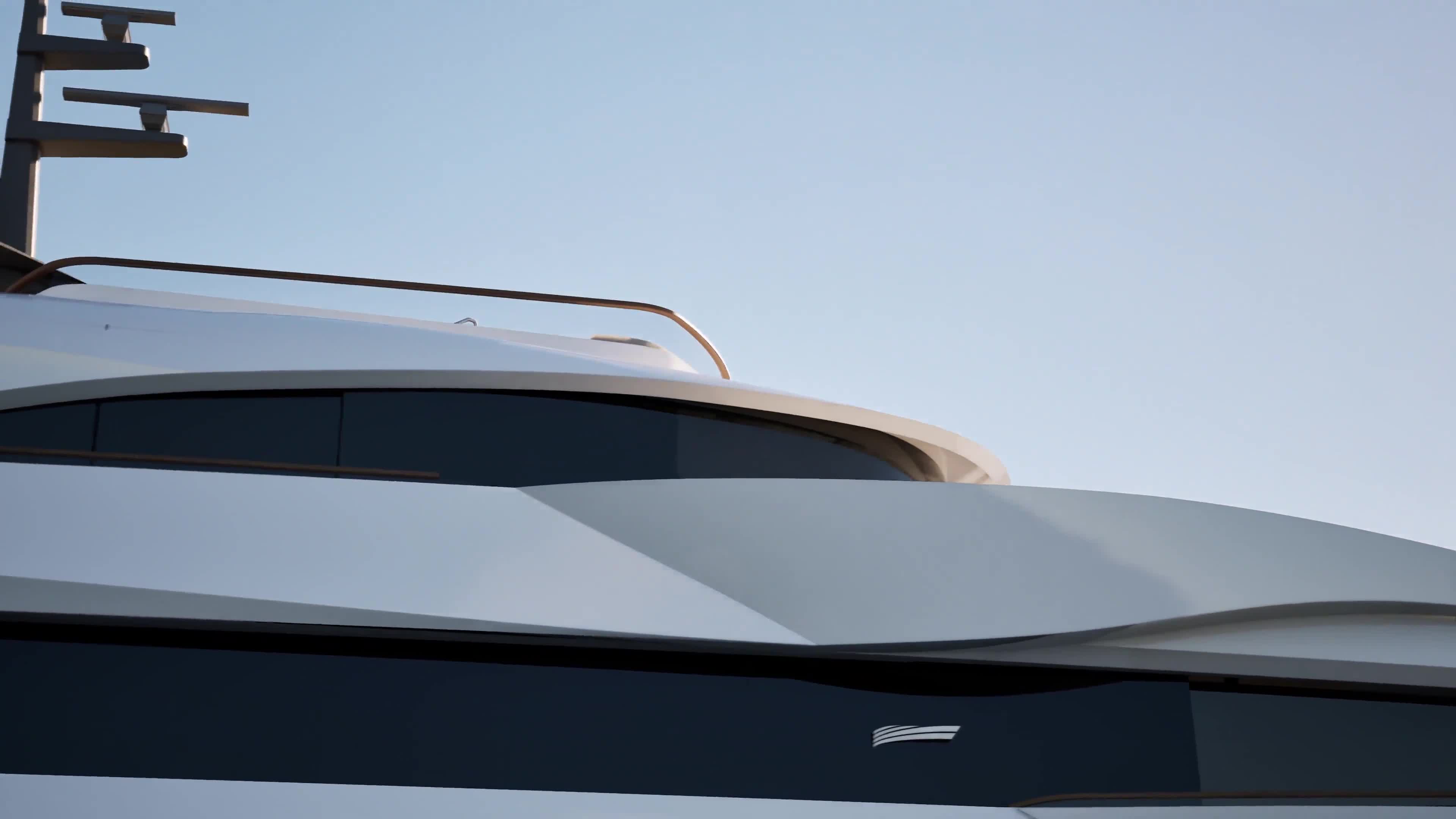 Structural features include flared bulwarks on the upper two decks, a practical solution that simultaneously improves sightlines from the bridge wings and expands deck space around the forward owner's suite.